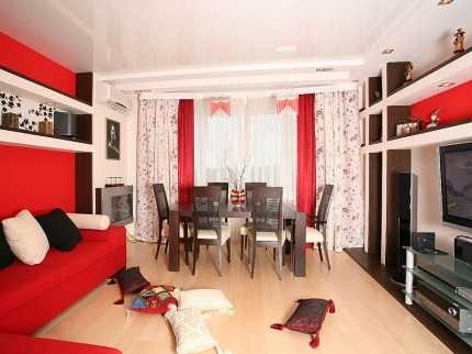 - При большой площади использование цветов значительно увеличивается. Можно попробовать придать роскоши, используя бордовые шторы и интересную, яркую раскраску на стенах. Это могут быть виниловые обои, которые на данный момент считаются очень модными и интересными. Можно использовать дополнительные предметы. Особенно это полезно, если в квартире кухня-столовая и ее нужно разделить на зоны.