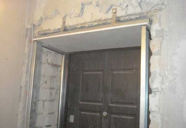 Для усиления конструкции на основные несущие элементы устанавливаются перемычки, особенно на углах между боковыми сторонами проема и верхней плоскостью. Затем прокладываются провода и кабели. Если для обшивки вы используете гипсокартон, достаточно закрепить его по периметру с помощью саморезов. Чтобы скрыть место стыка гипсокартона и стены, можно заполнить его раствором, но проще и быстрее закрыть его наличниками. На краях обязательно установите перфорированные уголки, а стыки заклейте специальной лентой. Остается только зашпаклевать поверхность и выровнять ее мелкой теркой.