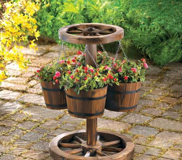 В саду великолепно выглядят подвесные кашпо. Этими поделками украшают отдельные деревья, места для чаепития, веранды. А изготовить кашпо можно из старых шляп, сумок, макраме, ботинок, резиновых игрушек и так далее.