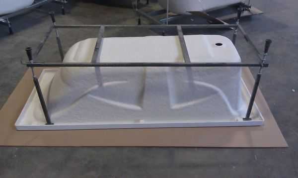 - Некоторые варианты основания предполагают крепление к чаше. Прикиньте заранее, на каком этапе сборки это будет проще сделать. Удобнее перевернуть ванну вверх дном, а каркас надеть сверху.