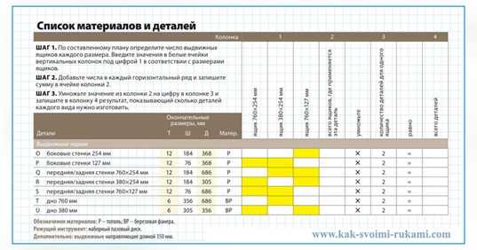 Определить необходимое количество деталей для изготовления корпусов, дверок и выдвижных ящиков помогут «Списки материалов» и «Схемы раскроя». Следуя указаниям в начале каждого списка, заполните соответствующие ячейки таблицы. Обратите внимание на то, что в некоторых корпусах, ящиках, фальшпанелях и дверцах встречаются одинаковые детали.