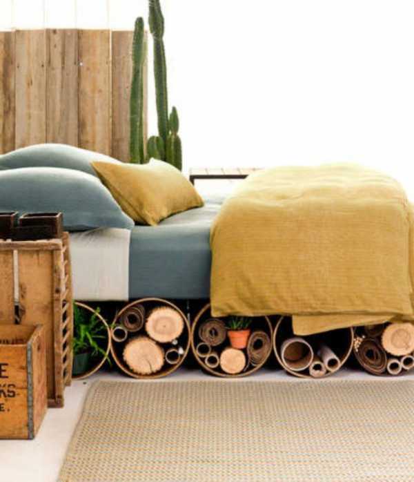 Рулоны из тонкой фанеры можно использовать для создания оригинальной системы хранения под кроватью. Такие необычные трубы прекрасно подойдут для хранения рулонов обоев, оставшихся после ремонта, журналов, а также для размещения небольших горшочков с живыми растениями.