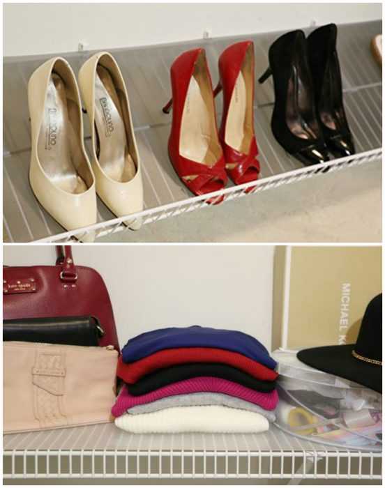 Решетчатые полки — это бюджетная и весьма практичная система хранения, с помощью которой можно существенно расширить возможности имеющегося шкафа. Такие полки подойдут для хранения одежды, обуви, головных уборов и коробок. А чтобы мелкие вещи не проскакивали сквозь решетку, накройте полочки листами толстой клеенки.