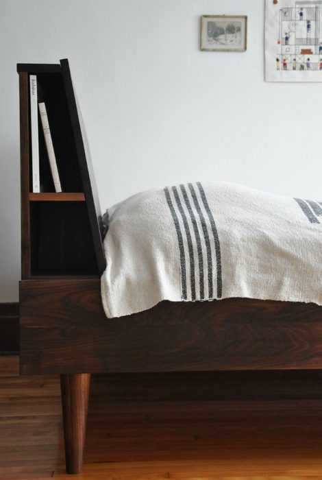 Владельцам маленьких спален, где каждый квадратный метр на счету, стоит обратить внимание на кровати с полками в изголовье. Конечно, такая система не сможет вместить в себя много, однако подойдет для хранения самых необходимых мелочей и избавит от необходимости покупки прикроватной тумбы.