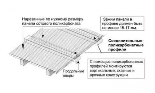 Каждый лист нужно класть на 3 дуги. Крепятся листы кровельными саморезами с использованием термошайб через каждые 0,5 м. Технология крепления листов поликарбоната предусматривает закреплять его не ближе 3 см от края листа, поэтому панелями поликарбоната укладываются с нахлестом в 30мм.