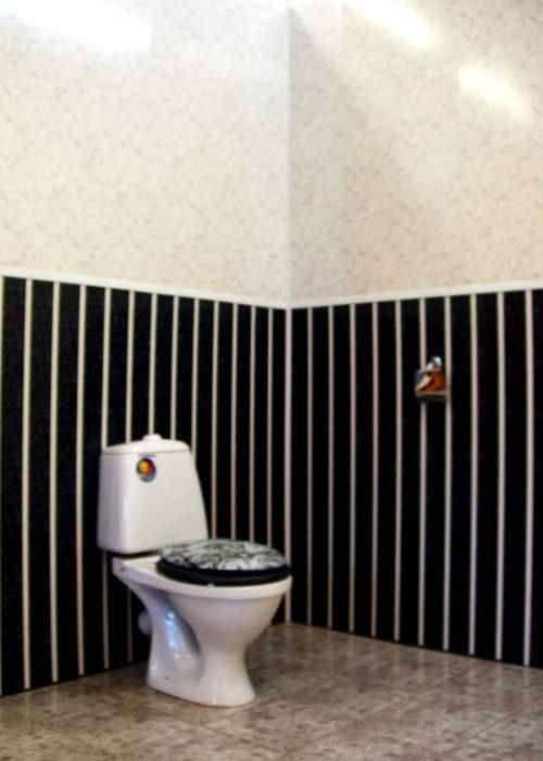 - Декоративные качества отделки мало чем уступает плитке. Пластиковые ламели бывают всех возможных цветов, с любыми рисунками и орнаментами, с любой поверхностью – матовой, жемчужной, зеркальной, имитирует любые натуральные материалы и так далее. На фото – туалет, обшитый пластиковыми ламелями.