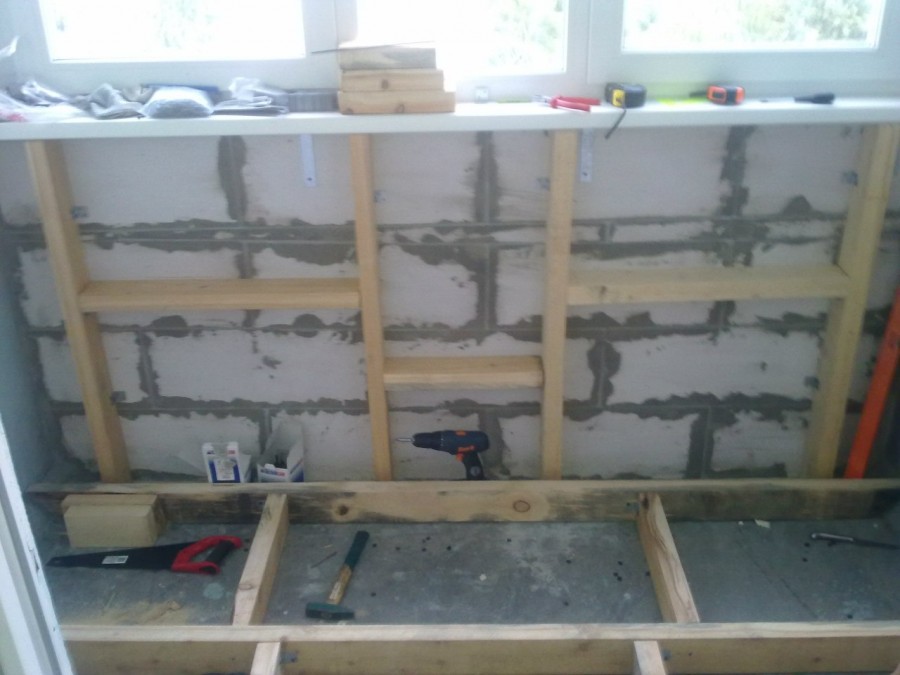 Затем следует утеплить парапет лоджии. Это возможно сделать множеством способов. Для этого подойдут такие теплоизолирующие материалы, как минеральная вата, пеноблоки толщиной от 100 миллиметров или пенополистирол. Основной ошибкой, которую зачастую допускают люди, делающие все своими руками, но, не имея при этом достаточного опыта, является крепление обрешетки из дерева или металлического короба непосредственно к холодной стене.