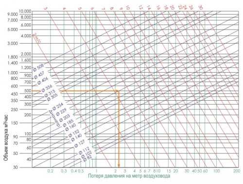 - для определения потери давления вам потребуется диаграмма, на которой найдите точку пересечения между мощностью вентилятора (горизонталь) и диаметром канала (диагональ). Опустите вертикаль и получите 7 Па на 1 м;