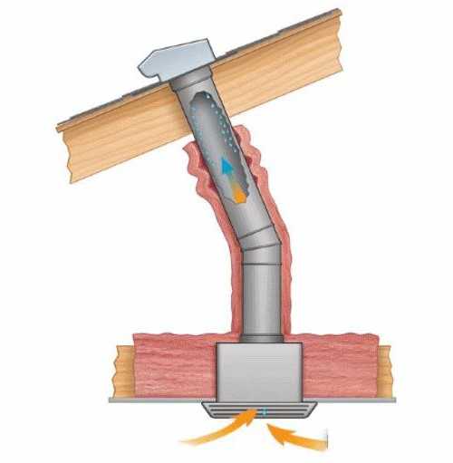 - Поместите отверстие вытяжной трубы под потолком, а саму труба выведите на 400-500 мм выше конька крыши.