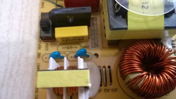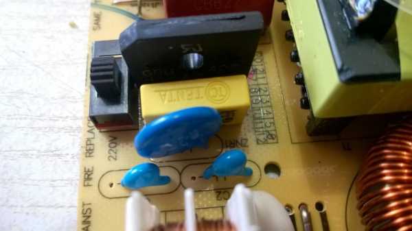 - Открыв корпус, проверяем работоспособность предохранителя. Если он работает, контролируем напряжение на конденсаторах (С22, С23). Они в это время должны находиться под напряжением. О его работоспособности свидетельствует значение около 310 В;