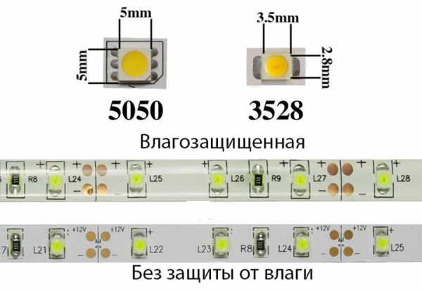 Каждая лента характеризуется количеством светодиодов, которые приходятся на один метр длины. Этот параметр обязательно должен указываться в маркировке. Поэтому, стоит учитывать, чем больше светодиодов приходится на один погонный метр, тем больше светоотдача и, соответственно, потребляемая мощность. Сами светодиоды могут располагаться в один ряд или в два. Также, они могут быть покрыты лаком или силиконом, или быть вообще без защиты.