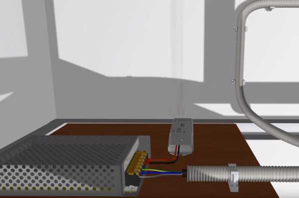 Далее нужно от этой распредкоробки в штробе, гофрорукаве или в кабельном канале проложить кабель к будущему месту установки блока питания. Для его размещения монтируете удобную полочку. Изготовить ее можно из кусков фанеры или гипсокартона. Рядом размещаете и диммер.