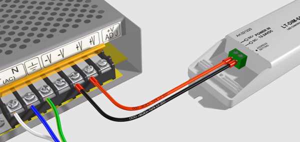 Оба провода должны подключаться к диммеру со стороны Power IN (входное питание). Провод красного цвета подключаете на диммере к плюсовой клемме DC+, а другой провод к клемме минус DC-