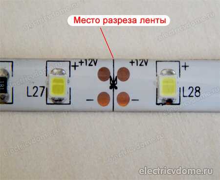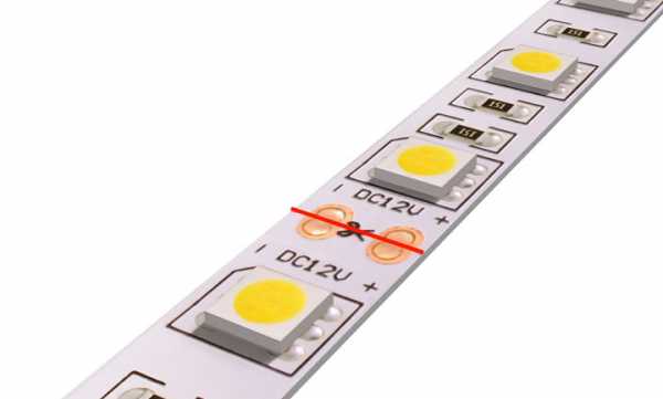 Можно переходить к монтажу самой ленты. Для этого ее нужно отмерить и разрезать на нужные куски. Сделать это можно не в любом месте, а только там, где нанесен пунктир или нарисованы ножницы.