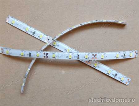 За основу ленты взята гибкая полоса, по длине которой расположены светодиоды. Они соединяются между собой в параллельно-последовательную цепь гибкими электрическими дорожками, благодаря чему, ленту можно разрезать на части по 3 или 6 диодов, в зависимости от напряжения. Линии возможного реза отмечаются на каждой ленте. Рядом с ними находятся специальные площадки для подключения проводов.