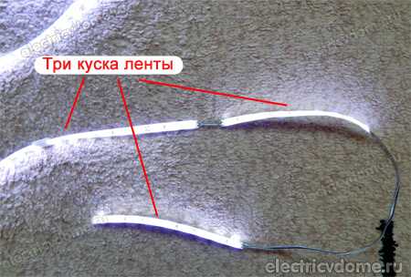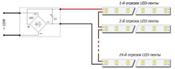 Светодиодная лента подключается параллельно, отрезками не более чем по 5 метров каждый.