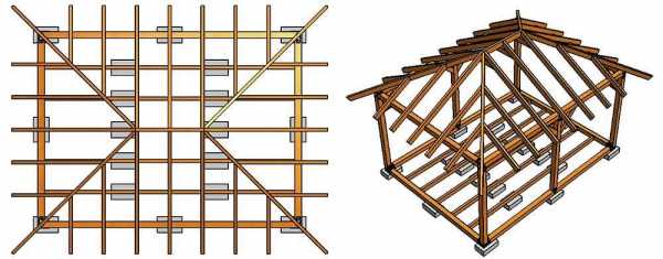 Стропильная система крыши четырехскатного вида принимает различный вид, в зависимости от исходных условий: площади перекрываемого дома и внутренней планировки. Выделяют три вида: