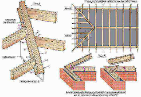 При сооружении вальмовых и шатровых каркасов используются такие специфические узлы стропильной системы четырехскатной крыши: