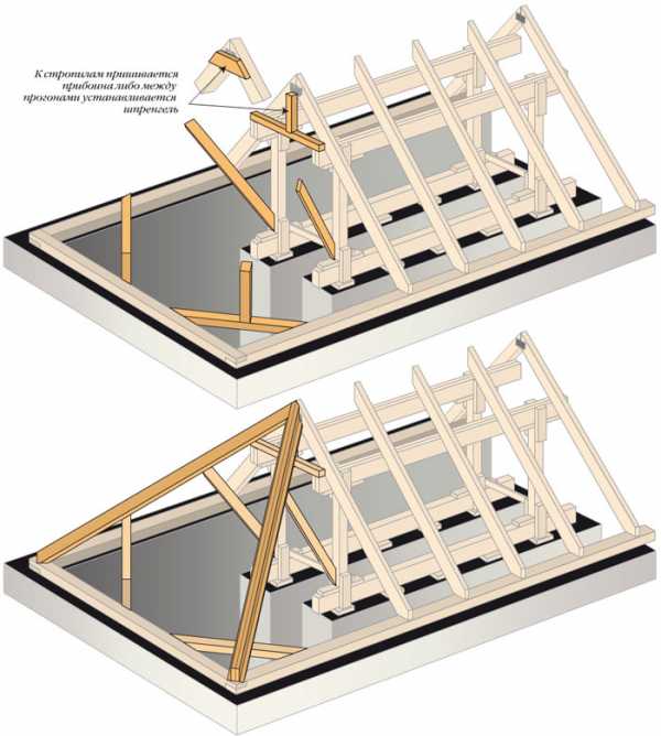 Теперь небольшое отступление. Если величина пролёта перекрываемого угловым стропилом больше 7,5 метров, помимо установленной нами стойки нужно поставить дополнительную стойку на расстоянии 1/4 пролёта от нижней точки опоры. Если перекрытия позволяют ставим стойку на них, либо делаем так называемый «шпренгель» (см. рис.).