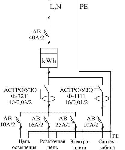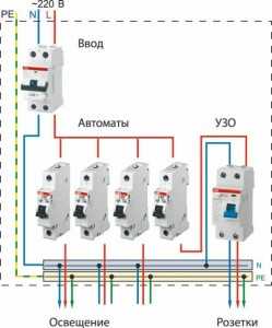 Согласно требованиям ДБН и ПТЭЭП каждый кабель должен иметь свою защиту с помощью УЗО (иногда их заменяют автоматическими выключателями). Исходя из этих норм, в электрическом щитке должна быть установлено следующее количество УЗО (АВ):