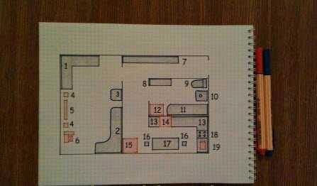 После этого нужно нанести на схему электрики места, в который будет находиться бытовая техника и мебель. Все предметы нужно пронумеровать, обозначить и выделить цветом потребителей электроэнергии.