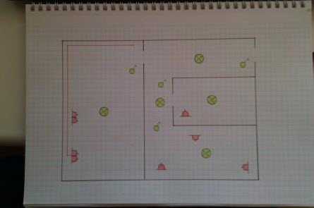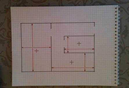 То же самое нужно делать и с длиной помещения, т.е. меряете и делите вдвое. Таким образом вы получите координаты середины помещения. По этим полученным координатам нужно обозначить центр помещения и на схеме обозначаете крестиком.