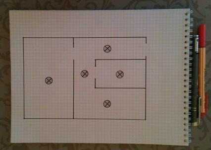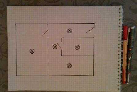 Если поменять нанесенные крестики на условные обозначения приборов освещения, то получится подобная схема электропроводки.