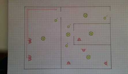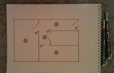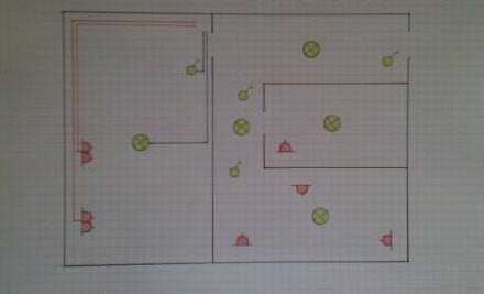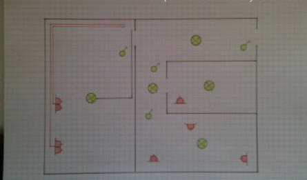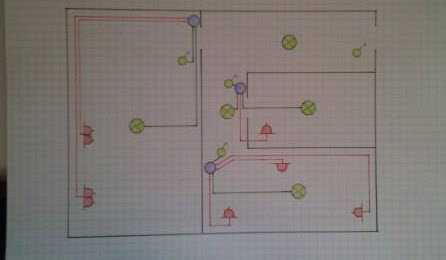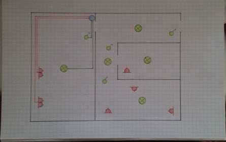 Именно для потребителей электроэнергии, выделенных красным цветом, будут нужны розетки. Теперь необходимо упростить вашу схему, т.е. убираем все предметы, а в тех местах, где будет находиться электроника нанесем на план электропроводки обозначения розеток. Должно получиться примерно следующее.
