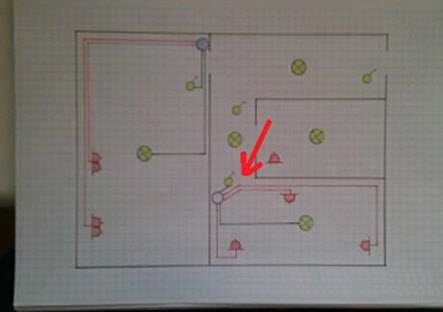 - Все кабели о провода на принципиальной схеме необходимо разводить в горизонтальных и вертикальных направлениях, при этом угол поворота линий должен быть прямым в 90 градусов. Электропроводка не должна иметь никаких отводов по диагонали хотя такой монтаж позволяет экономить на материалах, но согласно нормам это недопустимо. На монтажной схеме скрытая проводка наносится с привязкой к стенам, полу и потолку, то есть указывается расстояние от нее до этих конструктивных элементов дома. План расположения скрытой проводки необходим при проведении различных ремонтных работ.