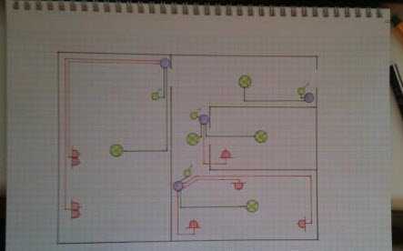 После учета вышеописанных нюансов можно приступать к составлению схемы прокладки провода. Для этого нужно использовать схемы, которые получились на первом этапе подготовки. Схемы электропроводки должны быть наложены друг на друга и будет получена общая картина.