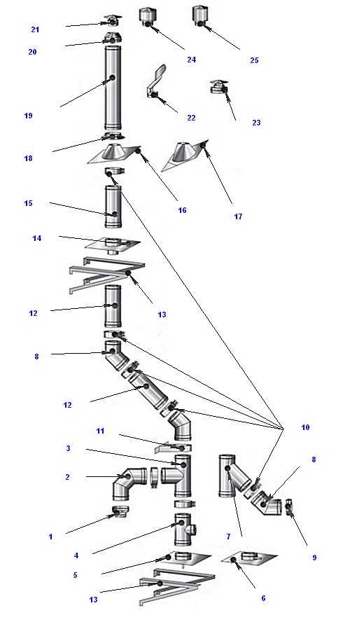Практически все ведущие производители сэндвич-дымоходов выпускают все необходимые детали и узлы для сборки полноценной системы. Возможно, есть некоторые технологические отличия между моделями различных брендов, но в целом деталировка сходна и выглядит следующим образом: