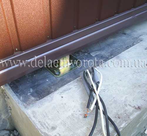 Ближний к электроприводу фотоэлемент (приемник, RX) требует 4-х жильного провода — 2 жилы питание, и еще 2 управляющие контакты. На схеме этот провод обозначен 4х0,35. Он идет от столба к приводу, Часто забывают, что нужен 4-х жильный кабели и кладут 2-х жильный, будьте внимательны. Этот кабель при возможности лучше спрятать в столб, оставив свободный конец 15-20 см. Если нет такой возможности нужно укрепить провод на столбе, благо крепежа для провода сейчас хватает. Часто этот провод прокладывают в швах между кирпичами, а потом заделывают раствором.