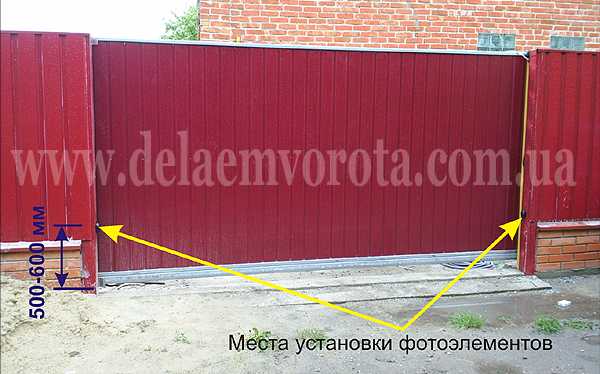 Первое, что вызывает затруднения это где устанавливать фотоэлементы. Фотоэлементы устанавливаются в торцах столбов, на одинаковой высоте 500-600мм от земли. См фото: