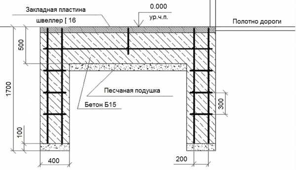 При этом поверхность швеллера должна располагаться горизонтально, и находиться на одном уровне с поверхностью грунта. Чтобы во время бетонирования каркас не сдвигался, его укрепляют подручными средствами – досками, деревянными распорками, кирпичами. Раствор готовят в стандартном соотношении: