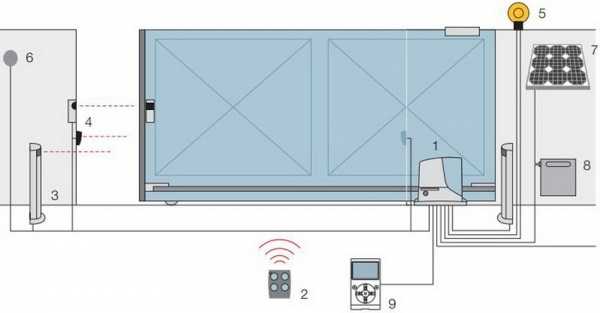 Схема автоматики для откатных ворот: 1 — электромеханический привод, 2 — пульт управления, 3 — фотоэлементы на стойке, 4 — фотоэлементы, 5 — сигнальная лампа, 6 — переключатель, 7 — солнечная панель, 8 — блок аккумуляторных батарей, 9 — многофункциональное устройство O-View