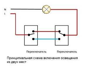 Схема подключения двух переключателей с разных мест (рисунок 3)При использовании двухклавишных переключателей количество подходящих к ним проводов увеличивается вдвое.