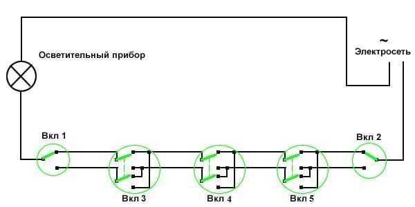 Для понимания принципа работы перекидного переключателя перекрестного типа необходимо изучить схему управления точками освещения из 3—5 точек. Но так как перекрестный выключатель всегда устанавливается между проходными и никогда не используется сам по себе, сначала нужно понять, как работает схема активизации и отключения освещения с обычными и проходными выключателями.