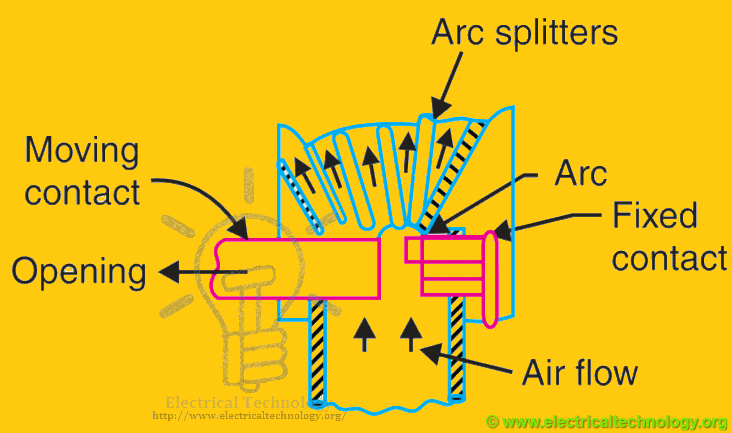 Автоматический выключатель снабжен камерой, окружающей контакт.Камера известна как «дугогасительная камера». Дуга заставлена вбивать в него. Дугогасительная камера поможет добиться охлаждения. Arc Желоб сделан из некоторого огнеупорного материала. Внутренние стенки дугогасительной камеры имеют такую форму, что дуга не только нагнетается в непосредственной близости, но и проникает в змеевидный канал, выступающий на стенке дугогасительной камеры.