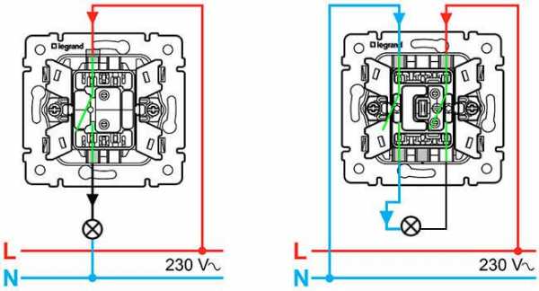 Рисунок 1. Принципиальная схема подключения однополюсного и двухполюсного одноклавишных выключателей