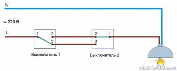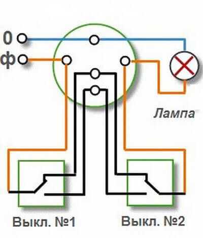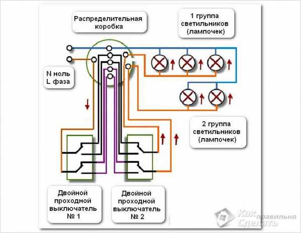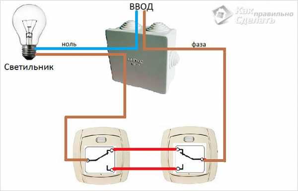 В завершение провод от общего контакта 2-го выключателя посредством распределительной коробки подключается к осветительному прибору.