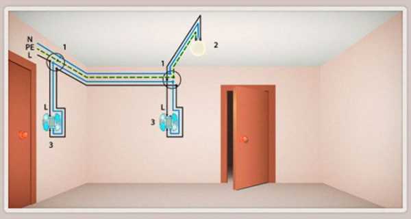 Рисунок 3. Монтажная схема подключения однополюсных одноклавишных проходных выключателей