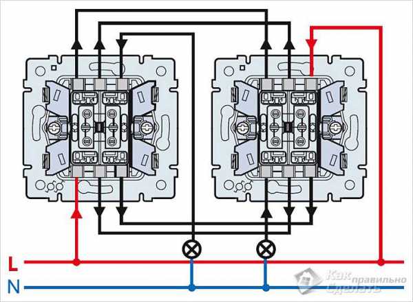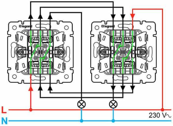 Рисунок 5. Принципиальная схема подключения проходного двухклавишного выключателя
