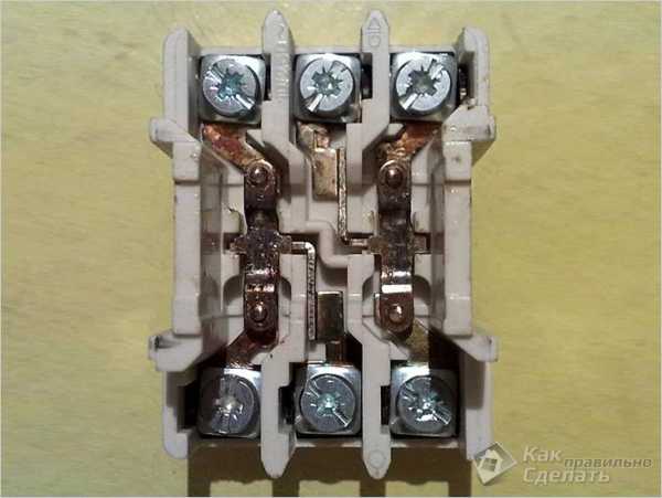 Кроме однополюсных переключателей бывают двухполюсные и даже трехполюсные переключатели.