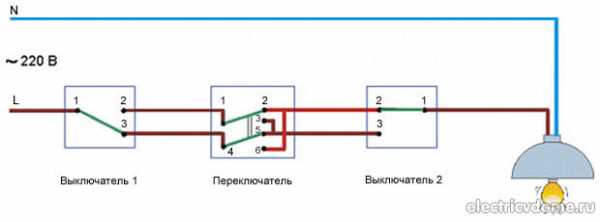 Рисунок 8. Монтажная схема подключения однополюсных одноклавишных проходных выключателей и промежуточного выключателя