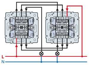 Двухклавишные переключатели проходного типа, как и аналоги с одной клавишей могут работать как перекрёстные приборы. Принцип переключения контактных групп имеет аналогичную схему с управлением светильником с двух мест. То есть, как и в предыдущем случае подключать нужно два двойных прибора и перекрёстный аналог в соответствии с определёнными этапами.