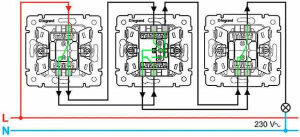 Бывают случаи, когда возникает необходимость во включении света в помещении не с одного или двух мест, а с трех, четырех и более. Для реализации такой схемы производители изготавливают промежуточные выключатели (переключатели). Пример схемы управления с трех мест показан на рисунке 7.