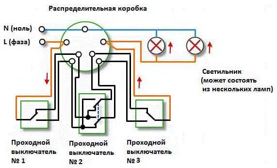От источника электроэнергии через коробку распределения к осветительному прибору подключается провод «ноля». Кабель фазы, также проходя через коробку, подключается на общий контакт первого переключателя. Выходные же контакты этого переключателя посредством коробки подсоединяются к выходным контактам следующего прибора.