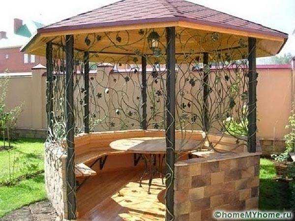 Нередко, владельцы, стремясь сэкономить, используют для возведения беседки, оставшиеся от основного строительства материалы, комбинируя железо, древесину и кирпич. Получаются интересные варианты: