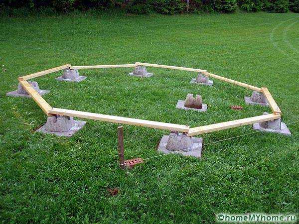 Для создания фундамента, по чертежу следует выкопать котлован. Хотя яму трудно назвать котлованом, если в ней глубина 80 сантиметров. Тем не менее, все следует называть по правилам строительства. На дно выкладывается слой песка. Ставятся опоры, которые потом бетонируют. Обязательно проверяйте уровнем ровность всех опор, удаленность их друг от друга, а также уровень по высоте.