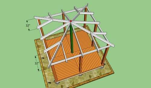 Анализируя написанное выше, можно с уверенностью сделать вывод, что для самостоятельного изготовления без специальных навыков годится деревянная беседка своими руками. Чертежи и размеры купола кровли следующие: